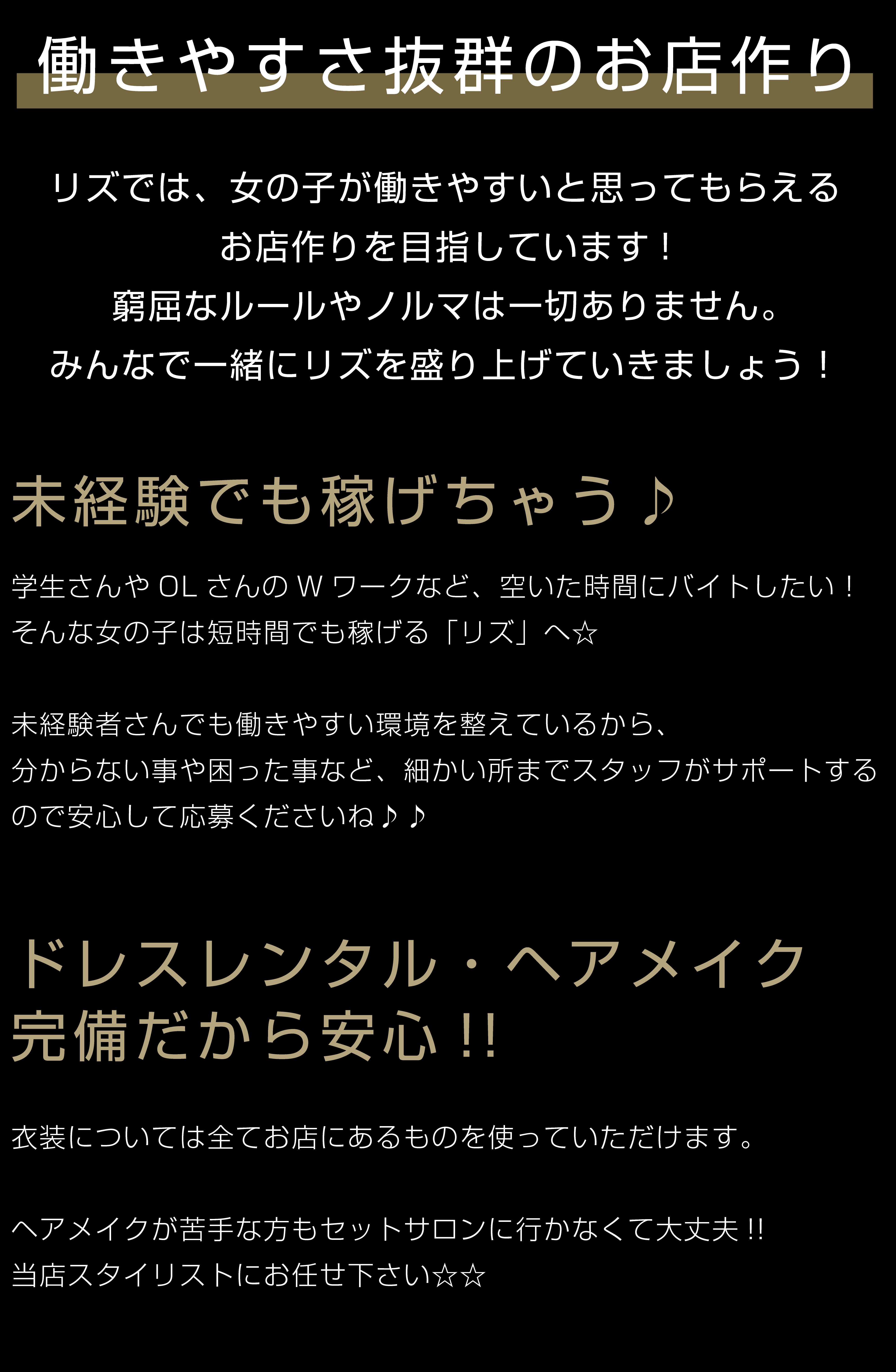 入店後も2つの料金システムで貴女がしっかり稼げるように応援致します! 資格 18歳以上(高校生不可) |